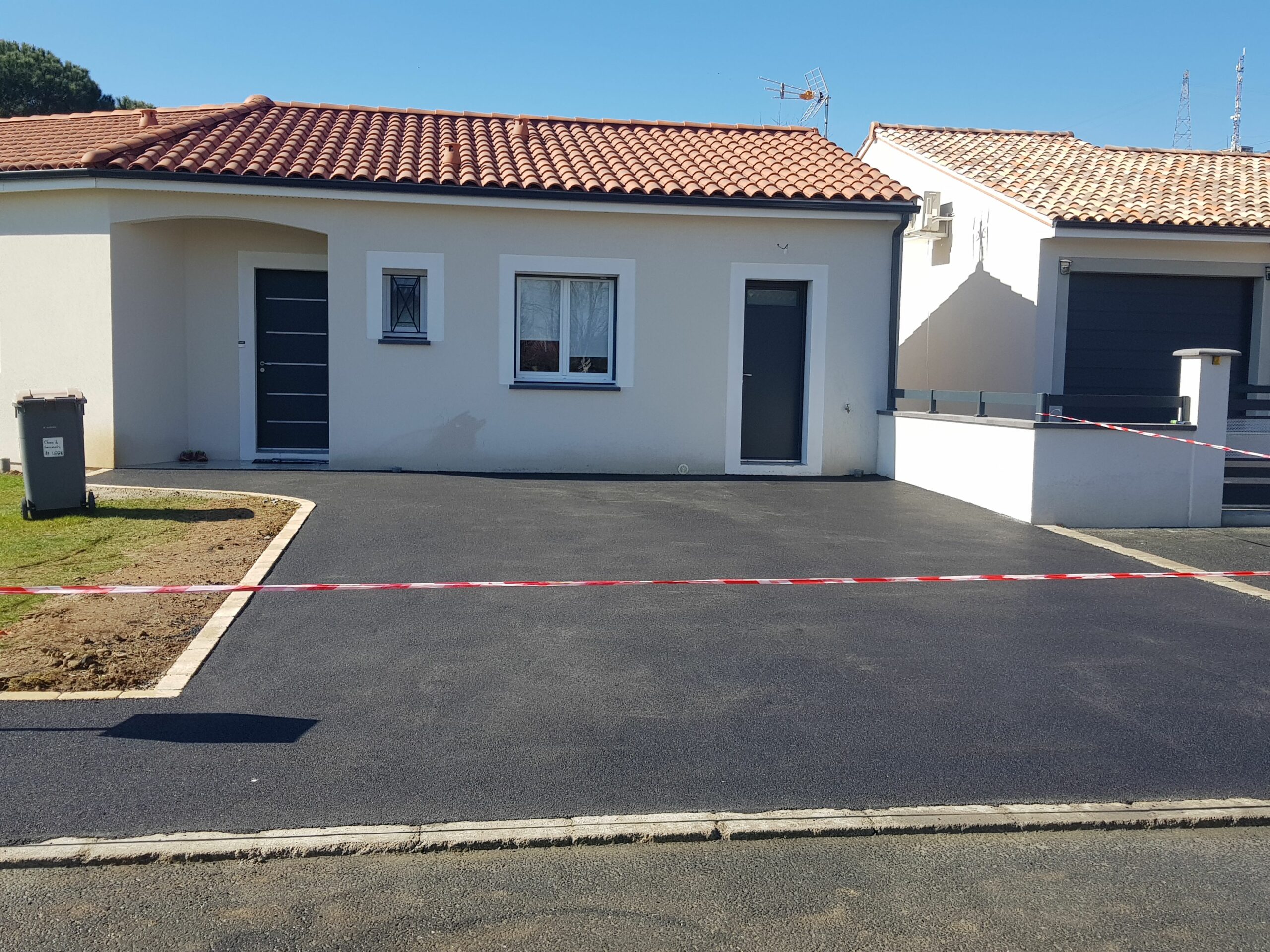 Préparation des surfaces, évacuation des terres, empierrement, puis application du goudron.